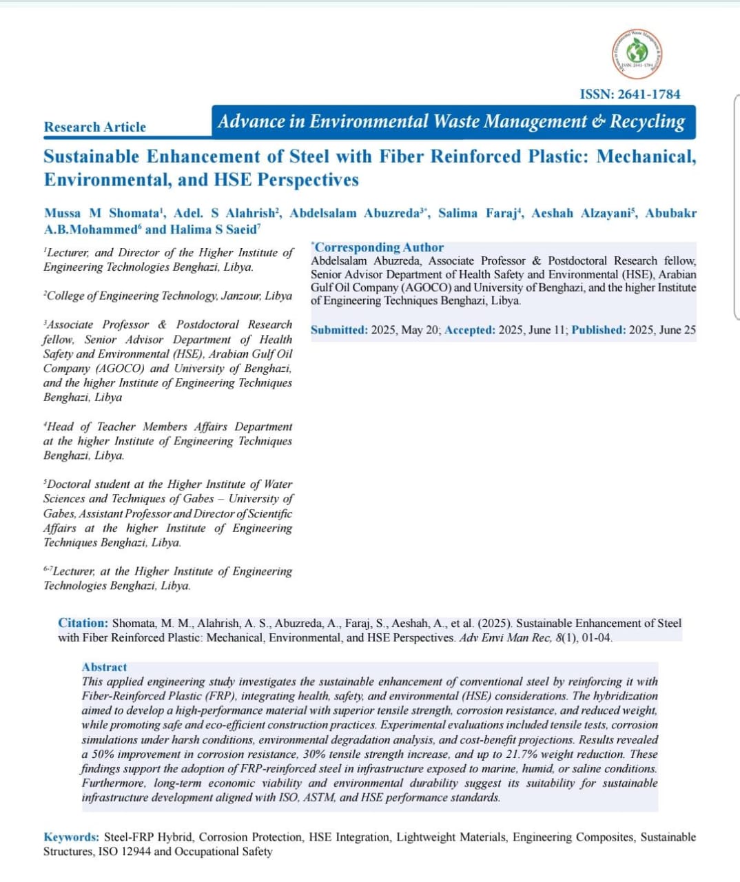 Abstract: This applied engineering study investigates the reinforcement of conventional steel with Fiber-Reinforced Plastic (FRP) to improve mechanical properties, corrosion resistance, and environmental sustainability while integrating Health, Safety, and Environmental (HSE) considerations. Results show a 50% increase in corrosion resistance, 30% improvement in tensile strength, and up to 21.7% weight reduction, supporting its use in harsh environments like marine and humid conditions. Economic analysis confirms long-term viability, with cost savings outweighing initial investments.